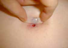 瘻孔が広がっている場合にはカテーテルの脇から漏れます。原因としてストッパーによる締め付けのために血流障害を生じ圧迫壊死を起こすことがあげられます。腹壁との間に余裕をもたせた状態で垂直に立てましょう。あまりに漏れがひどい場合にはカテーテルのサイズをあげるのではなく一旦抜いて瘻孔が自然に縮小するのを待った方が良い場合があります。 -