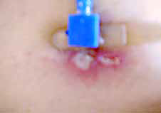 瘻孔周囲に発赤、疼痛などの炎症所見が出た場合には瘻孔周囲炎を疑います。原因として細菌による感染、ストッパーの過度の締め付けによる血流障害などがあげられます。進行すると皮膚の下に膿瘍を形成します。糖尿病など免疫機能が低下している患者さんでは重症化しやすいので早期に対処しなければいけません。抗菌薬の投与や切開などが必要になるので主治医の先生と相談しましょう。